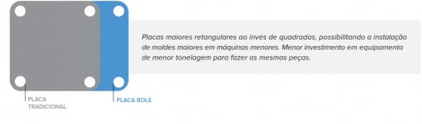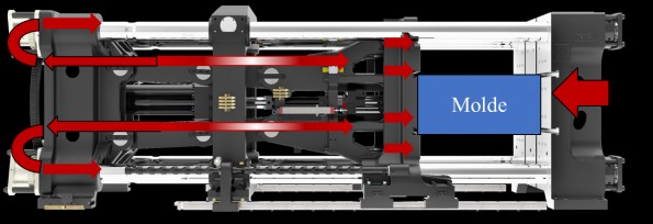 Também conta com placas e colunas da máquina e aproveitamento total da pressão de fechamento, evitando desperdício do material injetado. Equipamento com circuito fechado, garantindo maior fluxo e redução do tempo dos ciclos de produção.